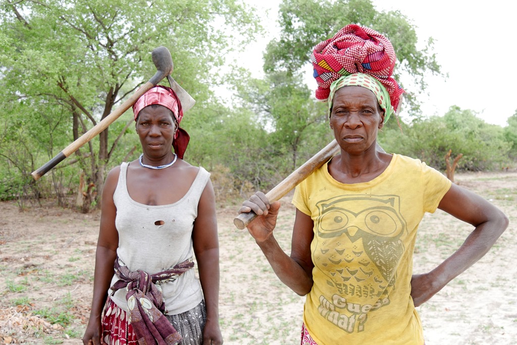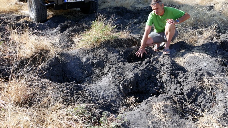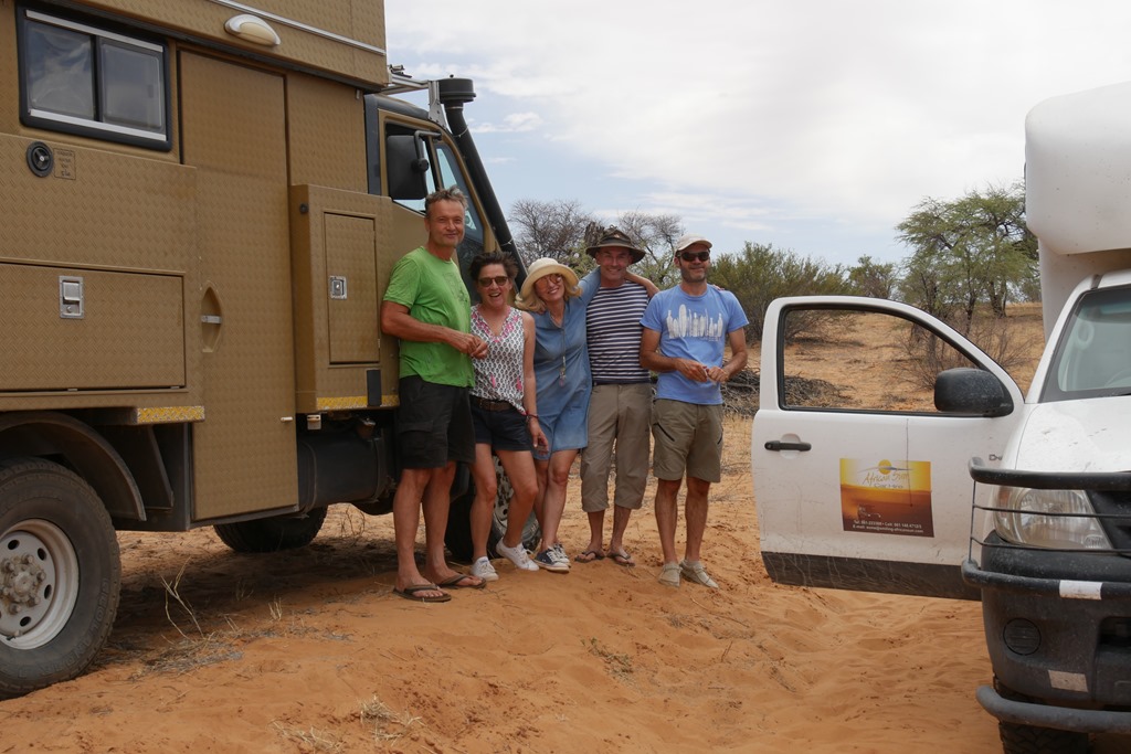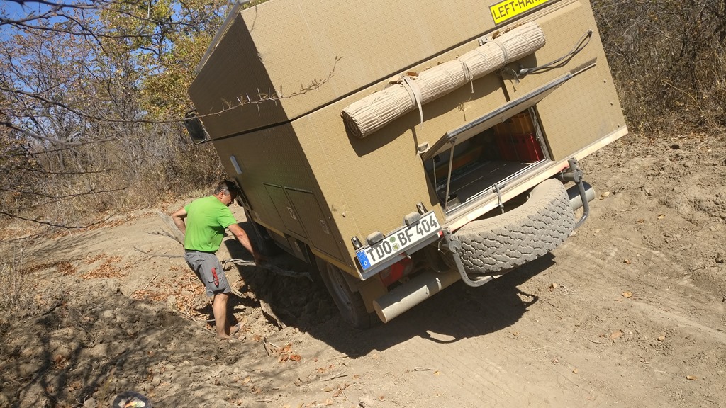 Der Boss der Truppe wollte uns einreden, wir wären unzulässiger Weise in einem Nationalpark. Hier konnte ich ihm aber unser geballtes Wissen entgegenhalten und ihm erklären, dass es auf botswanischer Seite, entlang der Grenze ja überhaupt keinen Nationalpark gibt. So entwaffnet änderte er seine Taktik und wollte uns nun mit den vielen Löwen und den umherstreifenden Wilderern Angst machen. Wir bedankten uns für seine wichtigen Warnungen und die ganze Angelegenheit endete dann noch mit einem lockeren Gespräch und einem Gruppenfoto. Im weiteren Streckenverlauf hatten wir uns aber dann mehrmals gewünscht, dass wir uns hätten vertreiben lassen. Die Strecke wurde nämlich immer katastrophaler. Es müssen Unmengen von Elefanten gewesen sein, welche während der Regenzeit die schlammige Piste ebenfalls genutzt hatten. Nun sind ihre Fußabdrücke von der Größe einer Bratpfanne für Großfamilien und der Tiefe eines Wassereimers, völlig ausgehärtet und eine „Freude“ für unser Auto und unsere Bandscheiben.