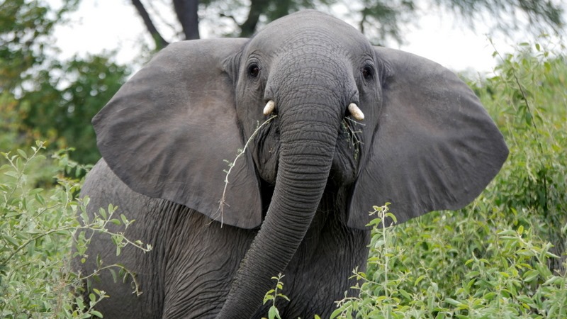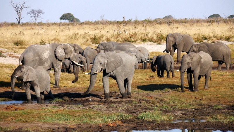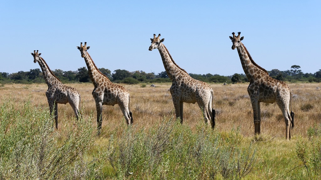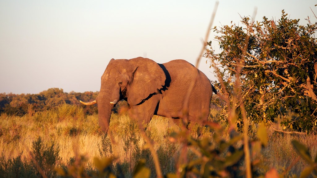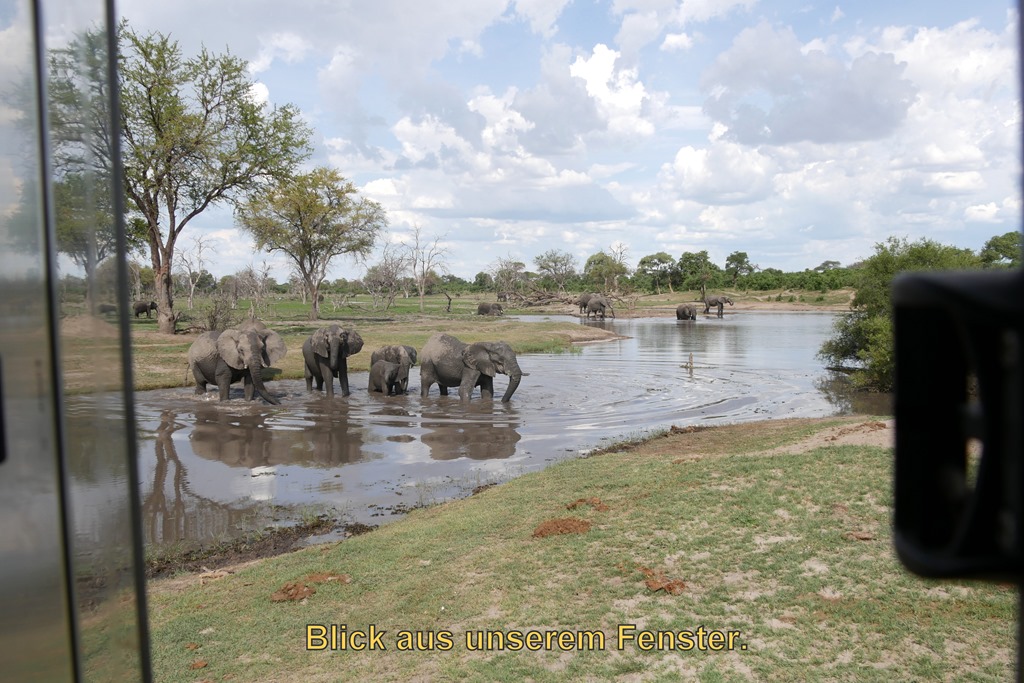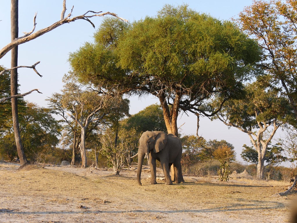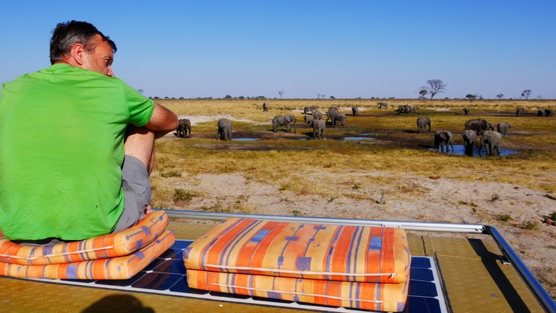 Nach zwei Tagen Zivilisation in Kasane sollte es nun wieder etwas Abenteuer sein. Dazu erschien uns die Hunters Road als sehr geeignet. Diese ist eine historische Handelsverbindung entlang der Grenze zu Simbabwe, auf welcher nach 1870 das im Norden erbeutete Elfenbein nach Süden abtransportiert wurde. Das Internet bot nur sehr spärliche und widersprüchliche Informationen zum Zustand der Strecke und darüber, ob es überhaupt noch erlaubt ist, diese ohne Genehmigung zu befahren, da diese ja nur wenige Meter neben der Grenze zu Simbabwe verläuft und deshalb dort mit Militärkontrollen und mit den militärisch ausgestatteten und auch so ausgebildeten Anti-Wilderer Einheiten zu rechnen ist. Das Abenteuer begann schon damit, überhaupt den Einstieg zur Route zu finden. Dieser befindet sich nämlich unmittelbar vor dem offiziellen Grenzübergang nach Simbabwe in Kazungula. Er war deshalb mit wartenden Lkw zugestellt und zudem noch mitten in einer Baustelle. Aber alles ging noch gut, die Tracker haben uns Platz gemacht und die Fahrt konnte beginnen. Nach anfänglich etwas zugewachsener Strecke verwandelte sich die Landschaft zusehends in eine wunderbar relativ offene Ebene mit vereinzelten großen und schönen Schirmakazien.  Und um dieses wirklich tolle Erlebnis noch zu perfektionieren und afrikanisch zu machen, kamen dann auch noch, wie auf Bestellung, die erhofften Tiere. Elefantenherden, Zebras, Antilopen und viele Giraffen in dieser Landschaft und in der Nachmittagssonne, ein fast unwirkliches Bild.