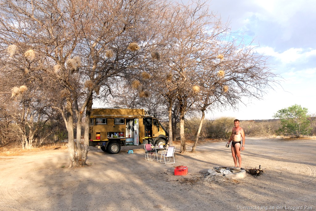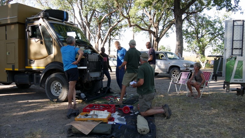 Seit einiger Zeit haben wir beim Starten des Autos sporadische Aussetzer, nicht oft, aber aller Tage mal. Weil uns das beunruhigt, suchen wir in Maun eine Werkstatt auf. So richtig 100 prozentig kann man sich hier auch nicht festlegen, aber man rät mir, den Starter zu wechseln. Und da ich wegen Geiz auch nicht im Busch vermodern möchte, sage ich zu. Zu sehen ist am alten Starter nix, aber ich hab jetzt einen Neuen drin. Seit dem ist das Problem aber wirklich nicht mehr aufgetreten. Es möge bitte so bleiben. In dieser Werkstatt spricht mich ein Mann, er ist ebenfalls Kunde in der Werkstatt, auf Deutsch an. Wir unterhalten uns sehr nett. Während des Gesprächs stellt sich heraus, dass er der Besitzer von „Tiaans Campsite“ ist. Das ist die Campsite, welche uns Bob (unser Lebensretter nach der folgenreichen Wasserdurchfahrt) aus Südafrika schon wärmstens empfohlen hatte. Das ist die Campsite, welche uns Bob (unser Lebensretter nach der folgenreichen Wasserdurchfahrt) aus Südafrika schon wärmstens empfohlen hatte. Was lag also näher, als auf unserer weiteren Reise Richtung Simbabwe doch mal bei ihm vorbei zu schauen. Die Ecke kennen wir zwar schon, die Campsite liegt unmittelbar am Boteti Fluss bei der schon oben beschriebener Fähre. Aber wo es schön war,da kann man auch 2 mal hinfahren. An der Rezeption begrüßt uns Tiaans Frau, sie ist Deutsche, und wir bekommen den letzten freien Platz. Hier ist alles sehr liebevoll eingerichtet, es gibt einen kleinen Pool, eine Terrasse mit tollem Blick auf den Fluss und in der kleinen Bar gibt es zu unserer Freude, auch wieder einen Fernseher. Somit ist sogar das Fußball WM Finale für den morgigen Tag gesichert. Vorher wollen wir aber noch einmal in den Nationalpark. Doch dazu müssten wir wieder über den Fluss und vom Fährmann auch wieder weit und breit nichts zu sehen. Wir verlassen uns auf Tiaans Hinweis, an welcher Stelle der Fluss problemlos zu durchfahren ist. Ich bin dieses Mal aber vorsichtiger und ziehe zuvor den Stecker vom Kühlerlüfter. Auch will ich langsamer fahren und wähle deshalb nur den ersten Gang in der Geländeuntersetzung. Nun noch die Sperren rein und es sollte eigentlich alles gut gehen. Ging es auch. Mit erhöhtem Puls und dem Herz in der Hosentasche ging es langsam aber stetig durch und drüben wieder den Hang hinauf. Wir haben uns dann bis zum späten Nachmittag an eine wildreiche Stelle am Fluss gestellt und einfach nur mal dem Treiben zugeschaut. Dabei haben wir fast noch den Anpfiff zum Finale verpasst. Nach zwei Tagen bei Tiaan sind wir heute etwas weiter Richtung Francistown gefahren. Weit sind wir aber nicht gekommen, da wir uns spontan entschieden hatten noch mal an unserem freien Platz am Boteti River zu übernachten. Unser nächstes Lebenszeichen wird dann, so der Plan, aus Simbabwe kommen. Bis dahin Euch alles Gute von Manuela und Matthias