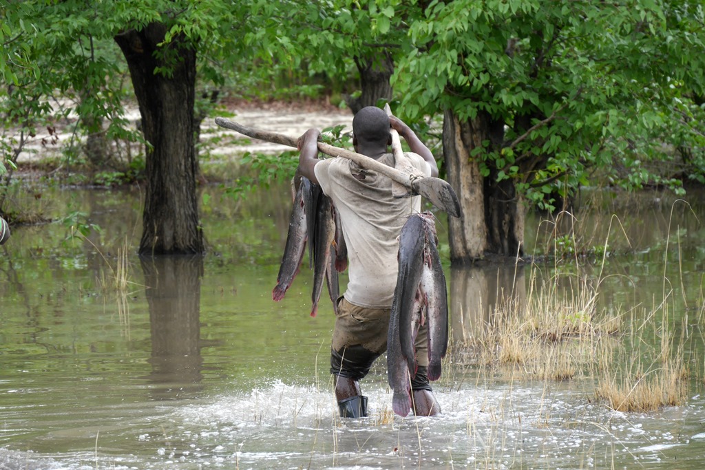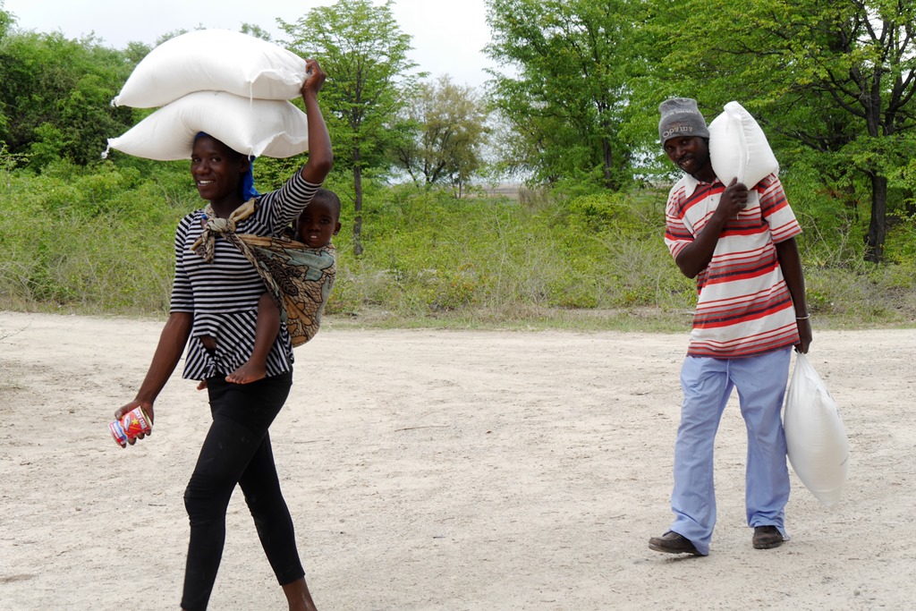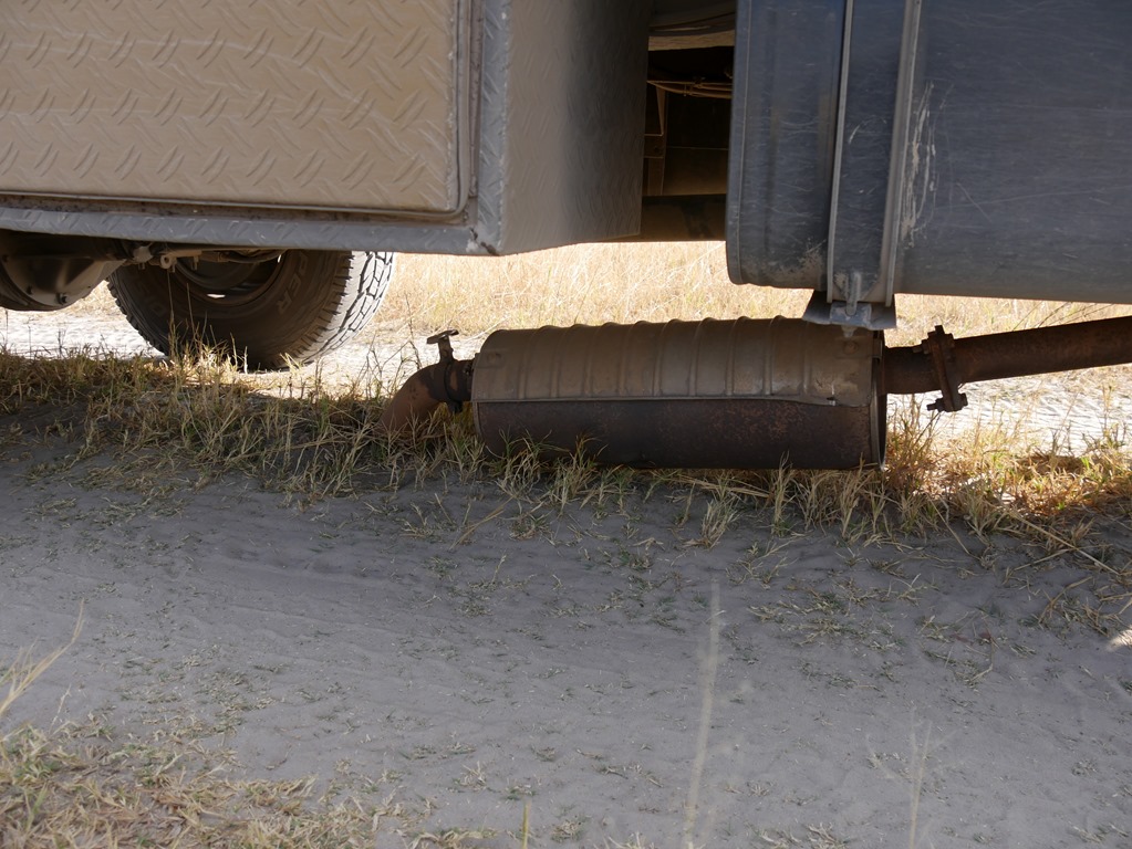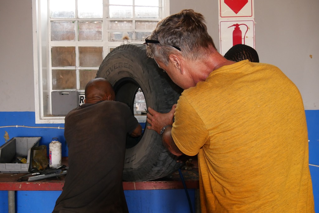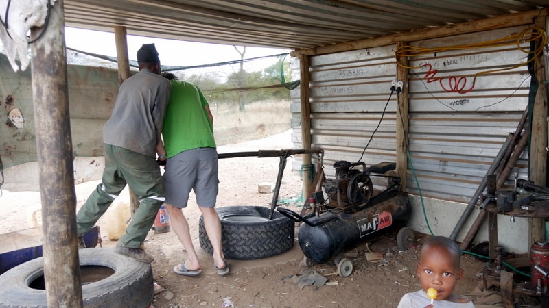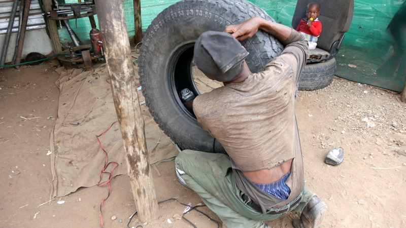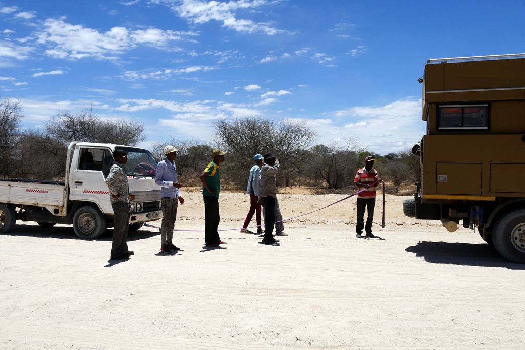 Den Höhepunkt des Tages war dann noch ein platter Reifen und beim Reifenwechsel im hohen Schilfgras fiel uns dann auch wieder die Löwenwarnung der Ranger ein. Bei dem Dorf Pandamatenga nahmen wir dann dankbar einen Stichweg zur Hauptstraße an, um im Dorf unseren Reifen reparieren zu lassen. Es ist immer wieder beeindruckend, wie und mit welch geringen technischen Voraussetzungen, die „Reifenflicker“ in den Dörfern ihr Handwerk gut hinbekommen.