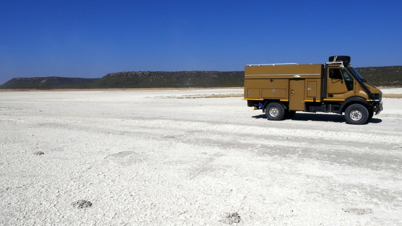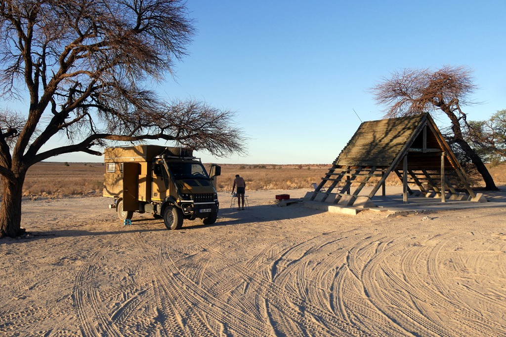 Leider können wir nun nicht mehr berichten, wie der Rest der Piste war, aber vielleicht macht es ja mal jemand noch. Über eine Info würden wir uns sehr freuen. Auf alle Fälle würde ich von dem Abschnitt im Bereich Kazumo Pan NP unbedingt abraten, es macht da wirklich keinen Spaß! Man kann davor auf die A33 wechseln und in Pandamatenga wieder auf die Hunters Road auffahren. Mit unserem nächsten Ziel, dem riesigen Komplex der Makgadikgadi Pans, sollten wir nun eine ganz andere Landschaftsform kennenlernen. Die beiden Hauptpfannen (Sowa Pan und Ntwetwe Pan) sind von Tausenden kleineren Pfannen umgeben. Dieses Gebiet gilt mit 12.000 Quadratkilometern Fläche als die größte zusammenhängende Salzpfanne der Welt. Unsere Visite beginnt im Nata Bird Sanctuary, einem sehr kleinen Nationalpark mit Schwerpunkt, wie der Name ja schon verrät, Vogelbeobachtung, hauptsächlich Pelikane, rosa Flamingos und andere Wasservögel. Aber auch Gnus und einige Antilopen waren zu sehen. Jedoch war für uns der Park eher enttäuschend. Die Campsite war zwar gepflegt und nett, aber die großen Mengen an Flamingos und Pelikanen waren zu weit entfernt und auch nicht über das Wegesystem erreichbar. Der ausgewiesene „River Drive“ war absolut nicht befahrbar, da in der letzten Regenzeit weggespült und nicht wieder hergerichtet. Somit halten wir uns hier nicht lange auf und ziehen auf der A3 weiter nach Süden. Nach etwa 40 km biegen wir, gleich nach dem Veterinär Gate, nach rechts auf eine passable Piste Richtung Kukonje Island ein. Dies ist eine bewachsene Insel inmitten der Sowa Salzpfanne und nur in den trockenen Monaten über eine etwa 6 km lange Salzpiste erreichbar. Die bekanntere und touristisch mehr genutzte Insel ist allerdings Kubu Island. Und genau deshalb haben wir uns für eine Übernachtung auf Kukonje Island entschieden-und haben es nicht bereut. Wir waren mit einer 4-Personen Familie die einzigen Übernachtungsgäste auf der gesamten Insel. Die einzelnen Campsites liegen zudem noch so weit auseinander, dass man das Gefühl hat, den tollen Sternenhimmel für sich allein zu haben. Übrigens Campsite Nr. 1 ist die mit Abstand am schönsten gelegene Campsite. Buchen kann man vor Ort in einer kleinen Hütte.