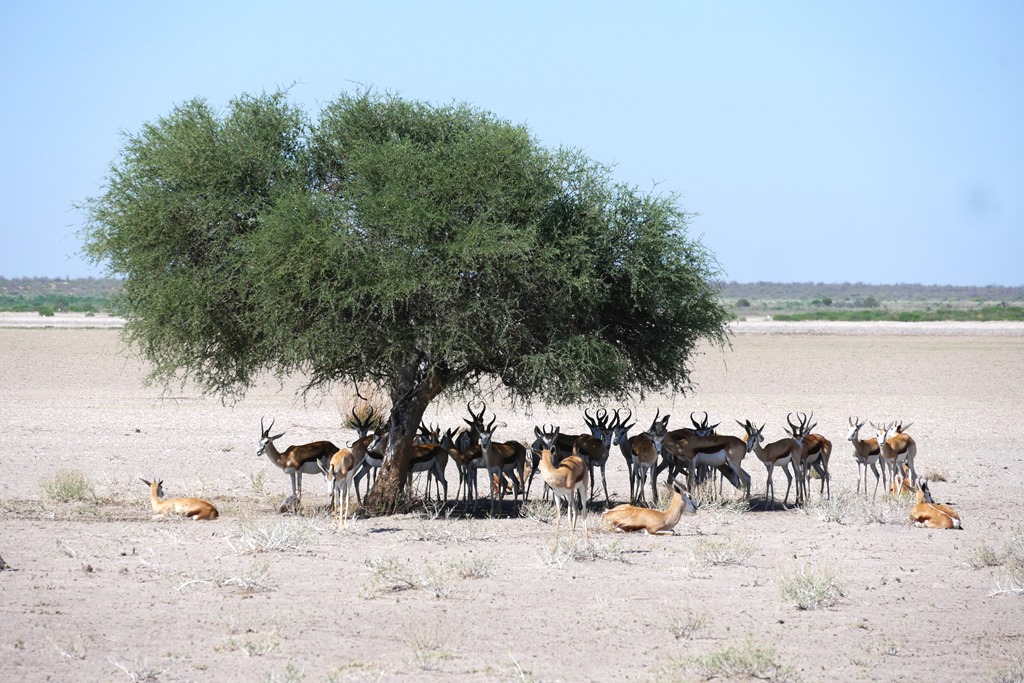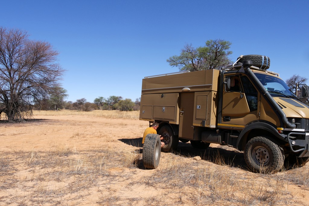 Am nächsten Tag fahren wir weiter nach Mosu, am Südende der Sowa Pan gelegen. Allerdings fahren wir nicht den Umweg bis A30, sondern nutzen den nur saisonal befahrbaren Weg unmittelbar am Südrand der Pfanne. Hierfür gibt ein kleines unscheinbares Gate, welches verschlossen und von dem Eigentümer des benachbarten Grundstückes beaufsichtigt wird. Auf unsere Frage, ob die Strecke z. Z. befahrbar ist, reagiert er unsicher. Schließlich sagt er, wir könnten ja fahren und sollte es wirklich nicht gehen, wieder zurück kommen. Das war der Startschuss zu einer landschaftlich wunderschönen und sehr einsamen Tour. Allerdings mussten wir einmal die Piste präparieren, um einen Umfaller zu verhindern und einmal Äste absägen (man möge uns verzeihen).