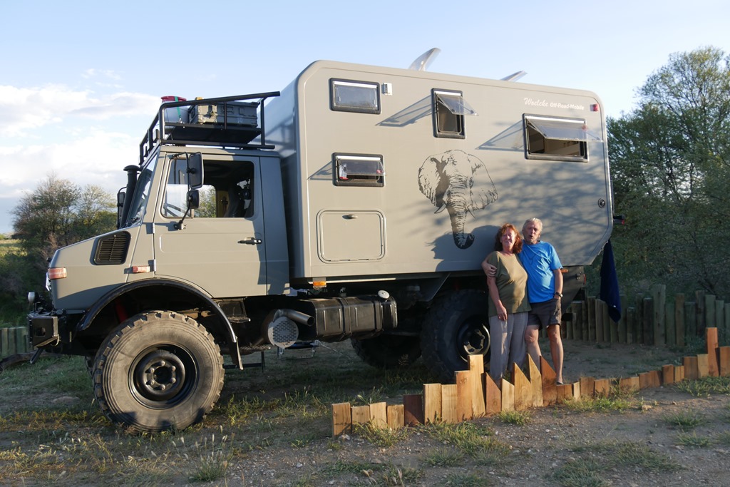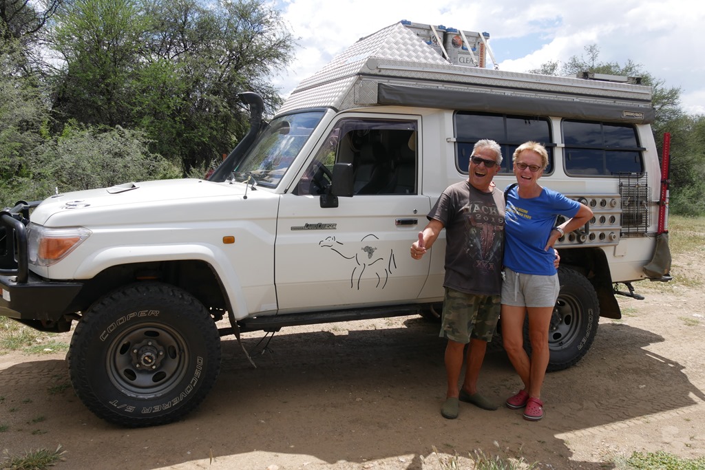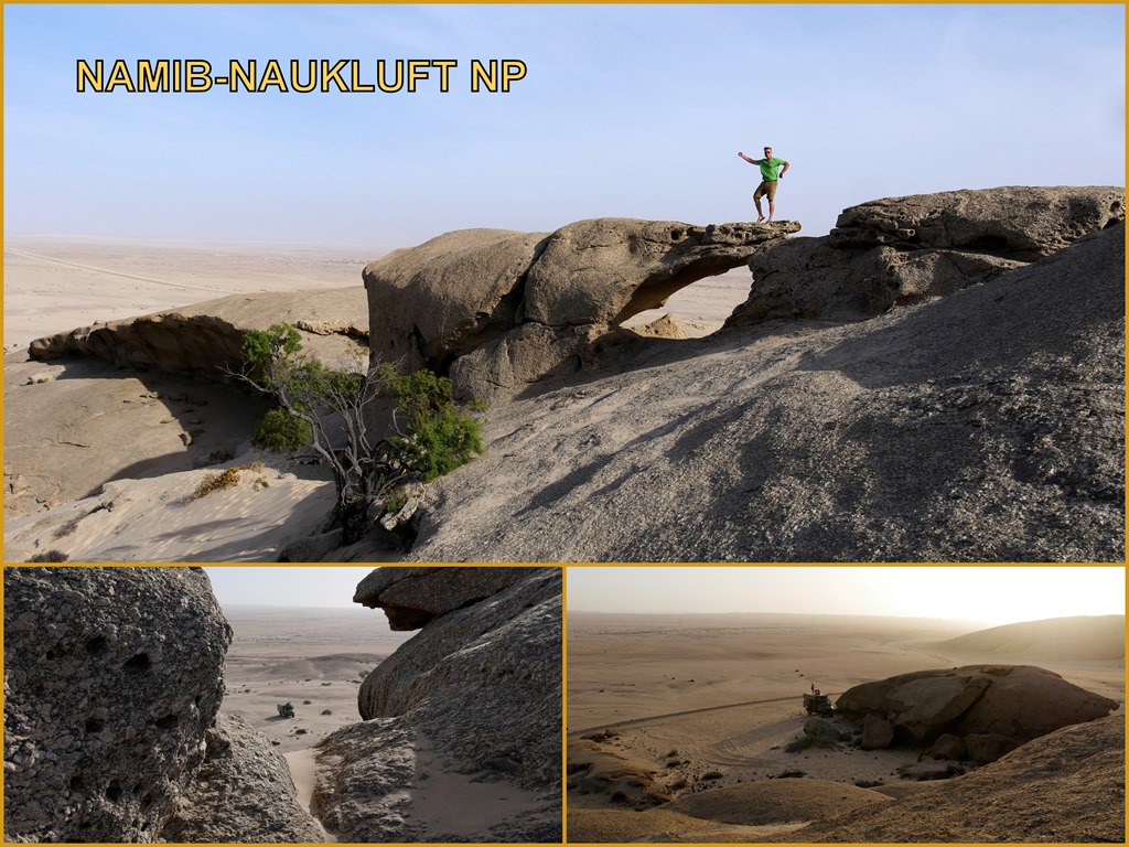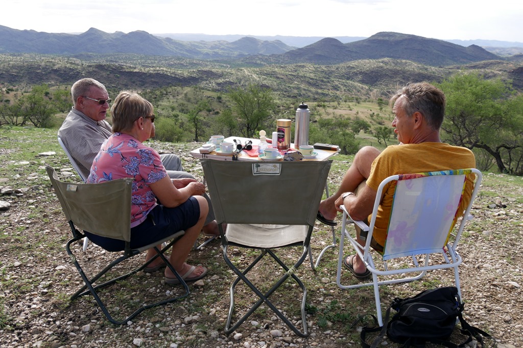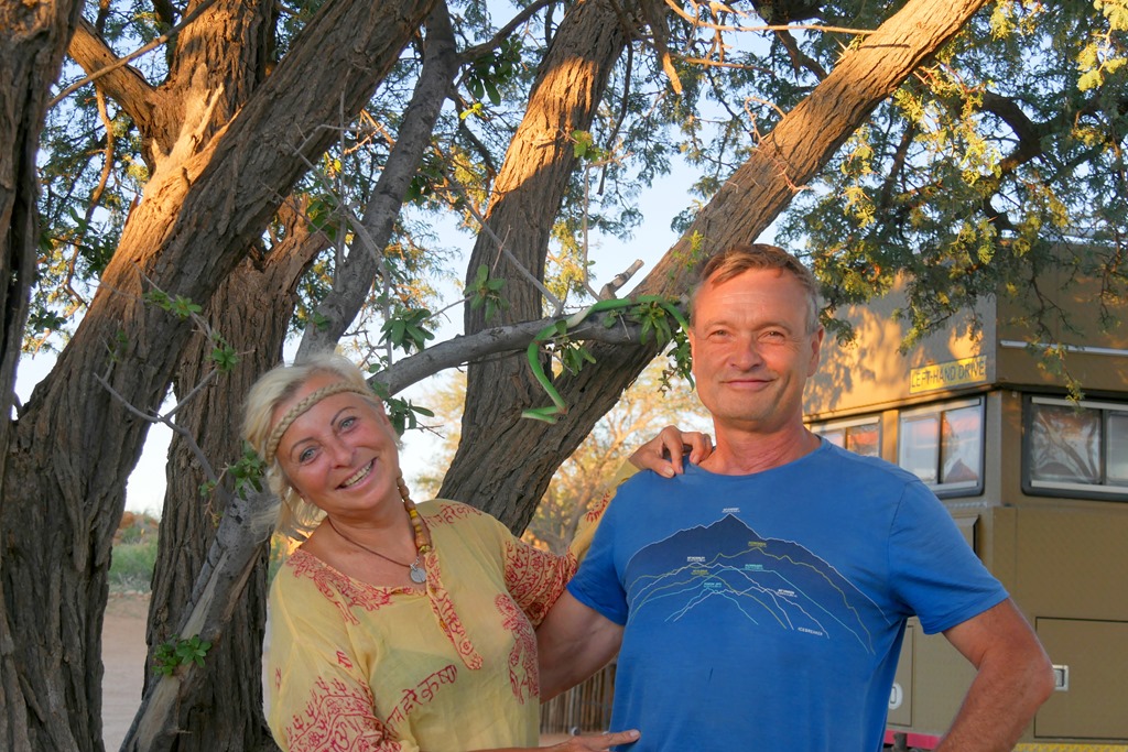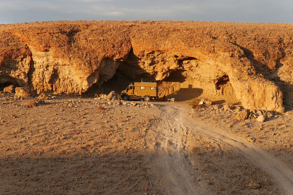Glück werden wir brauchen, denn Nachrichten von Reisebekannten scheinen unseren Plan für Südafrika in Frage zu stellen. Ihnen wurde nämlich, nachdem sie, genau wie wir, schon in 2019 für längere Zeit in SA gereist waren, nur ein Transit Visum für lediglich 7 Tage gewährt. Begründung: Weitere 90 Tage würden nur gewährt, wenn man aus einem anderen Land, ausgenommen den Nachbarstaaten von SA, einreist. Diese Regelung war uns zwar schon bekannt, sollte sich aber bisher nur auf den Fall beziehen, wenn man im laufenden Jahr über die maximalen 90 Tage bleiben wollte. Also wieder einmal alles unklar. Unser Plan deshalb: Einen möglichst sehr abgelegenen und demzufolge wenig frequentierten Übergang zu benutzen, in der Hoffnung, dass man da nicht so im Bilde ist, bzw. etwas nachlässiger seinen Dienst erledigt. Aber noch ist es nicht so weit, bis dahin sind es schon noch einige Tage. Wir freuen uns, nun nach den Tagen des Stadtlebens, wieder auf Achse, und vor allem wieder in der Natur zu sein. Über Walvis Bay erreichen wir wieder den Namib Naukluft Nationalpark. Diesen wollen wir queren, und dann ab Rehoboth, wieder auf Teer, nach Süden zum Fish River Canyon fahren. Dieser Canyon gehört zu den wenigen Höhepunkten, hier in Namibia, welche wir noch nicht gesehen haben. Jedoch zunächst eine Kaffeepause am „Vogelfederberg“. Diese Felsformation ragt hoch hinaus aus der Wüste und ist schon aus großer Entfernung zu sehen. Hier hatten wir schon auf der Hinfahrt übernachtet. Wir finden diesen Platz richtig toll, um hier den Sonnenuntergang und später den Sternenhimmel zu bewundern. Doch heute ist es noch früh am Tag und außerdem haben wir uns zur Nacht einen anderen tollen Platz, welchen wir aus dem Jahr 2016 noch sehr gut in Erinnerung haben, auserkoren. Kurz vor dem Verlassen des NP dann noch ein kurzer, aber holpriger Abstecher zum Aussichtspunkt des Kuiseb Canyon. Beeindruckend, aber wegen der schlimmen Trockenheit natürlich ohne Wasser und deshalb auch ein etwas trostloser und beklemmender Anblick. Nach dem Kuiseb Pass erreichen wir unser Tagesziel, unseren tollen Nachtplatz in einer schattenspendenden Grotte.