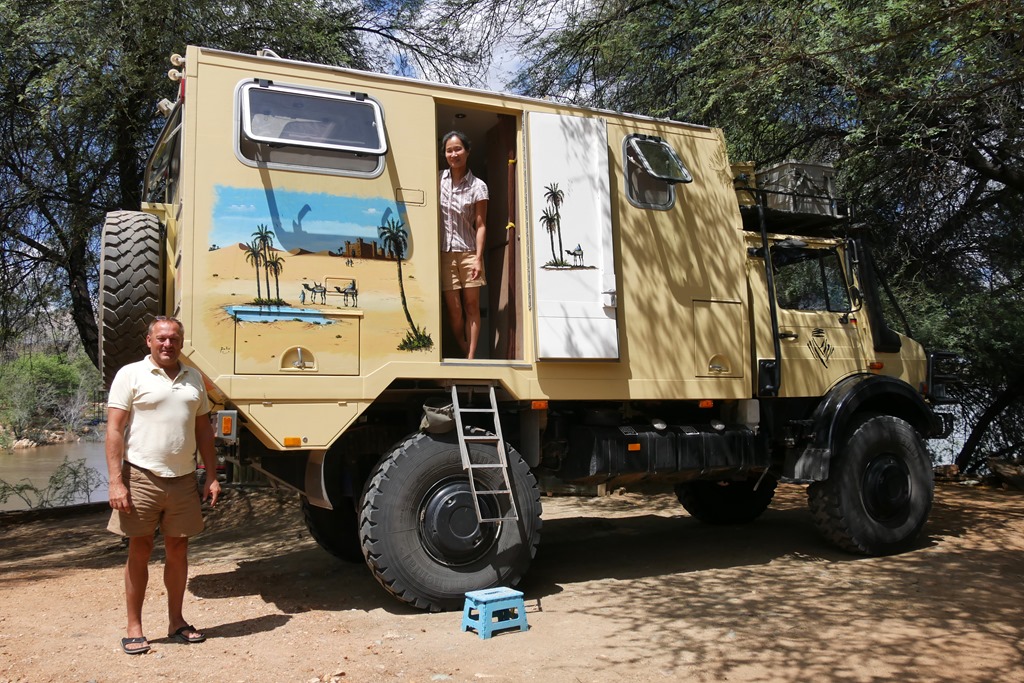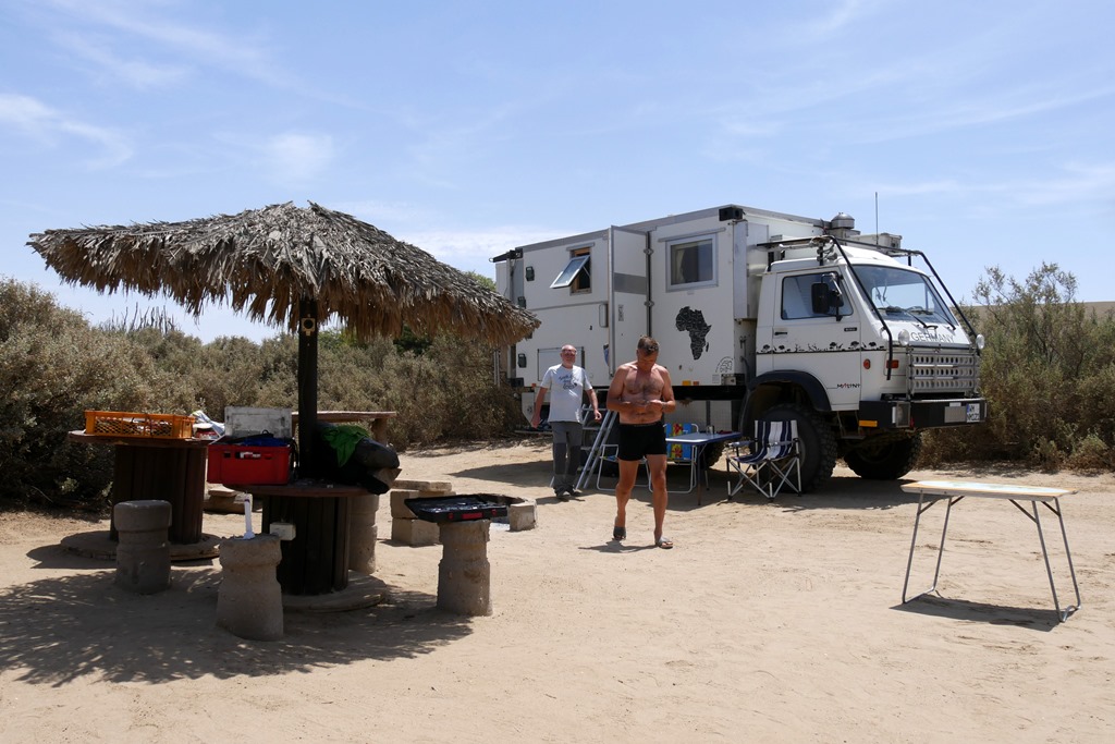 Jedoch, unsere farbigen Freunde konnten alle nicht schwimmen! Wohl ein Mangel an Gelegenheit. Die ersten etwa 80 km bis Sendelingsdrift führen auf Piste fast immer entlang des durch hohe Felsen eingeengten Fluss. Die Landschaft ist grandios und wir genießen die Abende an den schönsten Stellen am Fluss. Die zweite Hälfte der Strecke bis zum Grenzübergang bei Oranjemund ist zwar landschaftlich auch nicht übel, aber man sieht den Fluss nur noch gelegentlich und von der Strecke darf man wegen der vielen Diamantminen auch nicht abweichen. Dafür hat man aber nun perfekten Teer. Das grüne Oranjemund wirkt dann wie eine Oase mitten in der Wüstenlandschaft. Hier tanken wir noch mal billigen Diesel, kaufen ein und rollen mit einem flauen Gefühl in der Magengegend Richtung Grenze nach Südafrika. Werden wir unsere gewünschten 90 Tage oder nur klägliche 7 Tage Visum bekommen?