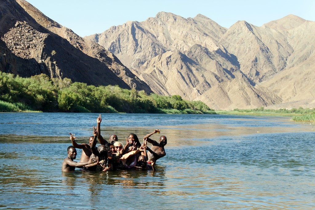 Weiter ging es auf der C 37 durch einsame, aber landschaftlich beeindruckende Wüstenlandschaft bis kurz vor „Außenkehr“, wo wir dann auf den „Oranje River“ gestoßen sind. Nun beginnt, wie wir später einstimmig feststellen werden, für uns eine der schönsten Strecken Namibias. Endlich mal ein Fluss mit Wasser und in dem man sogar baden kann!!! Sauberes Wasser, keine Hippos und auch keine Krokodile. So kam es dann auch, dass wir gleich die erste Möglichkeit nutzten, um ins kühle Nass zu springen. Und nicht nur wir hatten unseren Spaß daran.