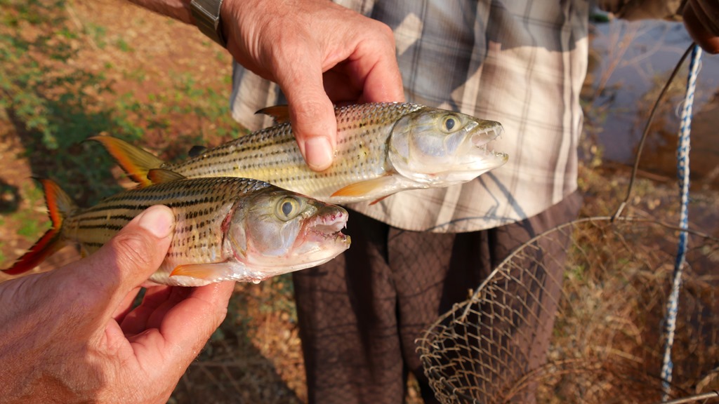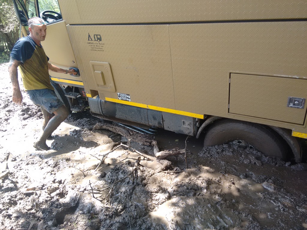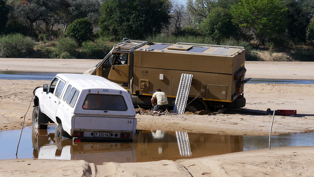 Hier am Ost Gate erwartete uns nun die nächste Überraschung. Wie übrigens bei allen Flussquerungen hier im Park, gibt es keine Brücken und man muss den Fluss, in mit Stocken markierten Furten, queren. So auch hier die Querung des Save. Als wir die Uferböschung erreichen, sehen wir, dass schon ein Toyota Geländewagen in der schmalen Furt hoffnungslos feststeckt. Die jungen Leute aus Österreich haben keine Chance, ohne fremde Hilfe weiter zu kommen. Klar, dass wir da helfen. Nur war hier das Problem, dass die schmale Furt ja nun „besetzt“ war und ich mich ja nun vor ihn setzen musste, um ihn rauszuziehen. Also sah ich mir den Bereich neben der Furt genauer (wie sich herausstellte, nicht genau genug) an und befand den Sand als trocken und tragfähig genug. Nun nur noch mit genügen Schwung drüber, wird schon funktionieren. Wenig später saß ich mit beiden Hinterrädern im flüssigen Sand. Der Sand war nur oberflächlich trocken und nur einen Spatenstich tiefer war alles Wasser. Wieder gelernt!