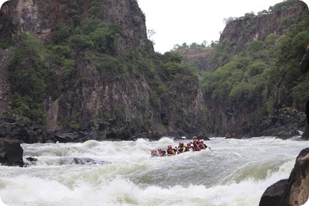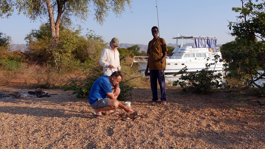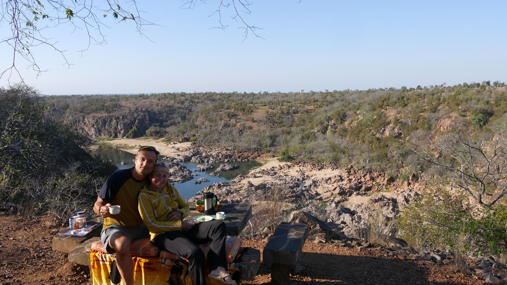 Also Sandbleche runter, Schaufel, Luftdruck reduzieren und eine halbe Stunde später standen beide Fahrzeuge wieder auf dem Trockenem, zunächst. Die Furt führte dann weiter über verschlungene Pfade über Sandbänke und mehrere Wasserpassagen. Kurz vor der rettenden Uferböschung saß dann der Toyota ein zweites Mal fest und die ganze Prozedur begann wieder von vorn. Die jungen Leute fuhren dann fröhlich winkend an uns vorüber, ja und wir hatten fast eine Stunde zu tun, um alles Bergezeugs wieder zu reinigen und an Ort und Stelle zu verstauen. Was tut man nicht alles für die Jugend. Fairerweise müssen wir aber sagen, dass sie sich natürlich vorher sehr für unsere Hilfe bedankt haben. Etwas Gutes hatte diese ganze Geschichte dann doch noch. Es war spät geworden und wir mussten uns schnell ein Übernachtungsplätzchen suchen. Dieses fanden wir gleich im ersten Anlauf auf dem kleinen Parkplatz der Civilila Falls. Sehr einsam mit traumhaften Blick in die Save Schlucht und zu den Fällen. Hier gibt es sehr schöne Picknick Bänke aus Stein, ein Schattendach und kein Mensch störte diese einsame Idylle.