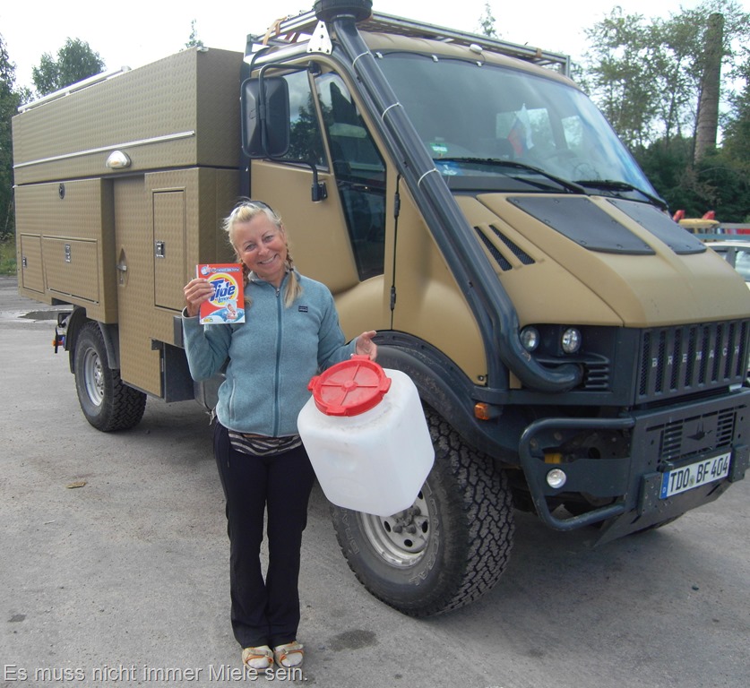 Funktionsweise: Man fülle die Waschmaschine (wie zu Hause) mit Wäsche, Wasser und Waschpulver. Stelle sie vor Beginn der Fahrt in das Wohnmobil. Die russischen Straßen erledigen den Waschgang wie von selbst. Haben schon das Öko-Siegel beantragt, weil es super funktioniert und dazu auch noch ohne Strom läuft.