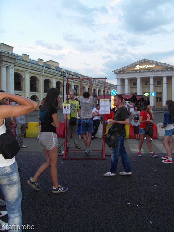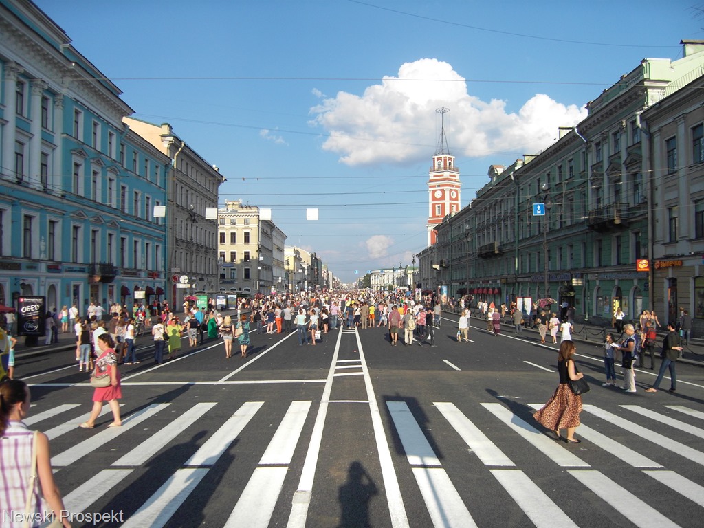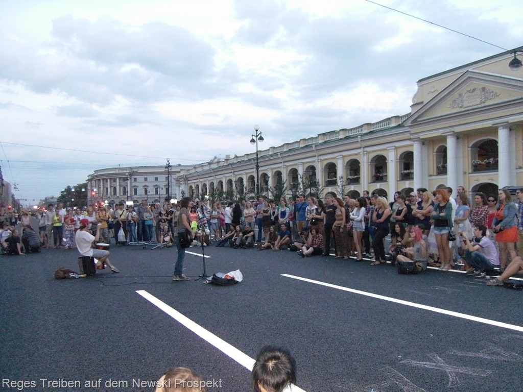 Der 4,5 km lange Newski-Prospekt bildet auf seiner ganzen Länge das pulsierende Zentrum Petersburgs, was noch um Mitternacht zu spüren war. Ein Glücksfall für uns war zu dem, dass ein großer Teil des sonst stark befahrenen Newski-Prospekts wegen Bauarbeiten zum letzten mal an diesem Sonntag für Autos gesperrt war. Die Petersburger haben das sichtlich genossen – es war wie ein großes Volksfest, überall Musiker und Kleindarsteller.