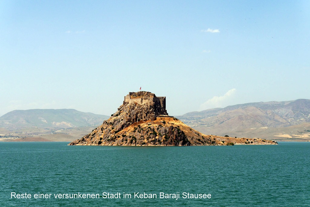 Nach ruhiger Nacht fahren wir weiter über Elazig nach Mezeliköy, von wo man den zweitgrößten Stausee der Türkei, den Keban Baraji, mit der Fähre überqueren muss. Auf der Überfahrt kann man eine zur Insel gewordene Festung bestaunen, diese ist der Rest einer den Fluten geopferten Ortschaft.