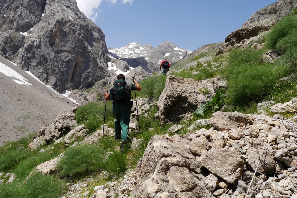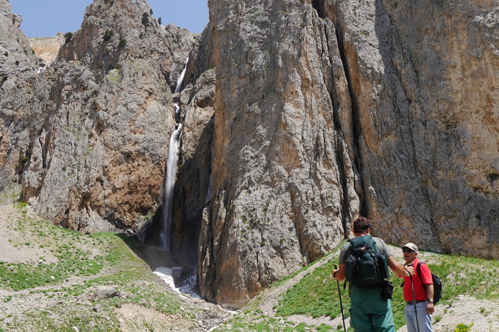 Pünktlich um 8 Uhr trafen wir uns an der verabredeten Stelle und fuhren mit unserem Auto noch einige km bis zum Einstieg der Tour. Wir hatten uns auf eine Wanderung durch ein Tal, aufsteigend zu mehreren Wasserfällen, geeinigt. Ismail “entpuppte” sich als ein absoluter Glückstreffer. Er geht fast täglich in die Berge (meistens allein), ist hier geboren, kann sehr viel über Natur und Geschichte der Region vermitteln und er hat sich wunderbar nach unserem Lauftempo gerichtet (er ist fit wie ein Turnschuh). Am Ende hat es sogar noch für eine kleine Zugabe, in Form einer Passbesteigung gereicht, und nach 8 Stunden waren wir, ziemlich k.o., wieder am Auto. Wunderschöne, aber recht anstrengende, über Geröll und mehrere Bäche (natürlich ohne Brücken), führende Tour.