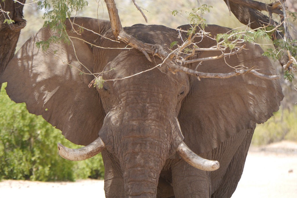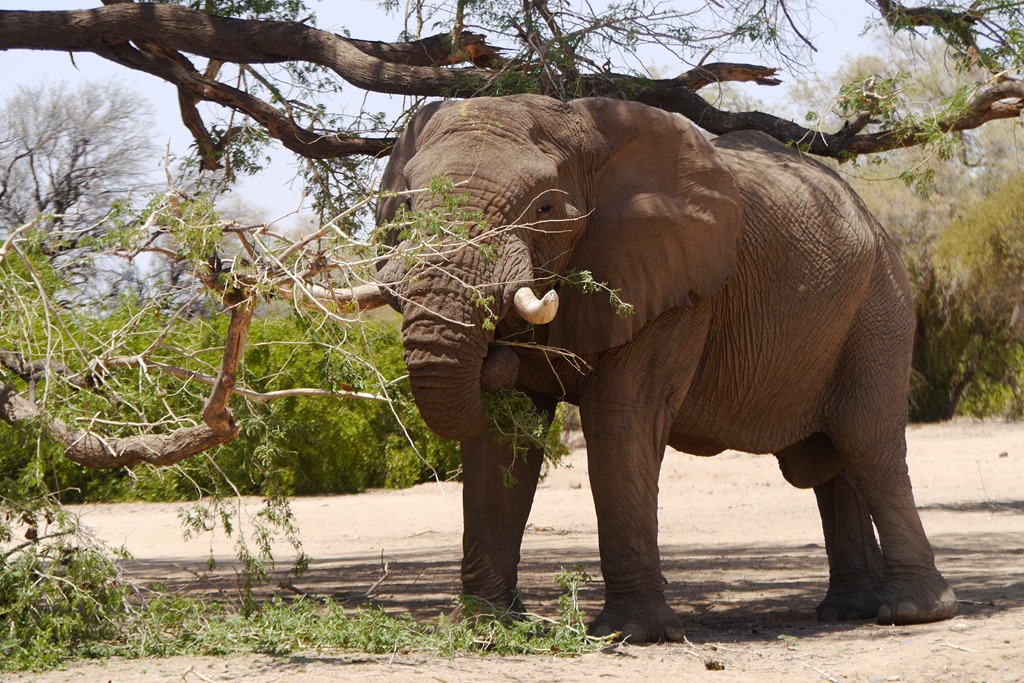 Zwei der Dickhäuter machten sich gerade über die Äste eines Baumes her. Beeindruckend, mit welcher Leichtigkeit die Mädels mehr als armdicke Äste vom Baum brechen und genüsslich Kleinholz daraus machen. Wie ich mich dagegen mit meinem Kaminholz schwer tu. Das sollte nicht unsere einzige Elefantenbegegnung im Ugab Fluss bleiben. Insgesamt haben wir elf Stück bestaunen können. Wobei in der Nacht am einsamen Platz im Fluss schon etwas Jurassic-Park Feeling aufkam, als unmittelbar beim Auto Äste gewaltig knackten und später im Mondlicht ein Elefant so nah am Auto vorbeiging, dass dieses sogar ein wenig wackelte. Am nächsten Morgen waren wir aber dann schon so “cool”, dass wir sogar weiter vor dem Auto sitzen blieben, währenddessen 30 m neben uns zwei “Elis” unermüdlich einen Baum malträtierten. Obwohl wir immer ein Auge auf die beiden Elefanten hatten, gab es auf einmal hinter unserem Auto einen fürchterlichen Schnaufer und ein Blick unters Auto sagte uns: Diese Schuhgröße kennen wir nicht!!! So schnell waren wir noch nie im Auto. Er wollte aber nur mal von unserem Schattenbaum naschen und das in 5 m Entfernung, einfach stark! Nach diesen Erlebnissen, nur in diesem Flusstal, waren wir uns einig, allein schon dafür hat sich diese Reise gelohnt.