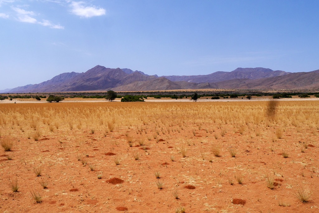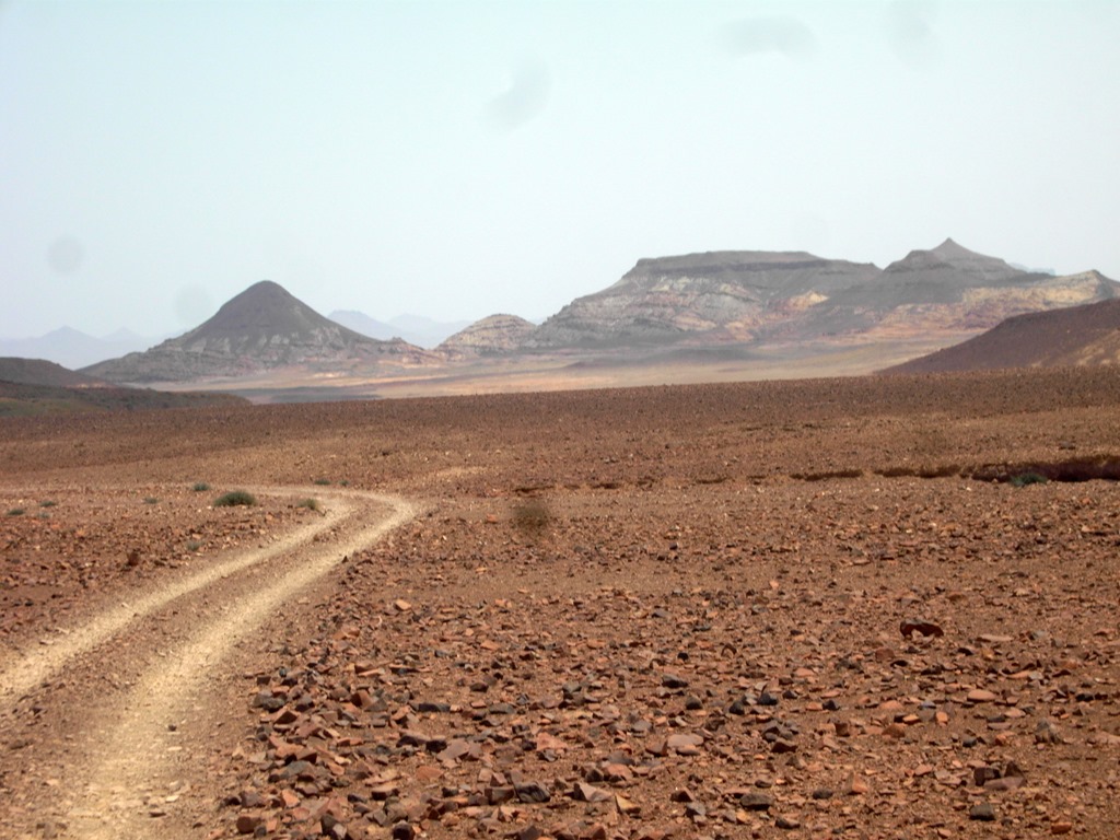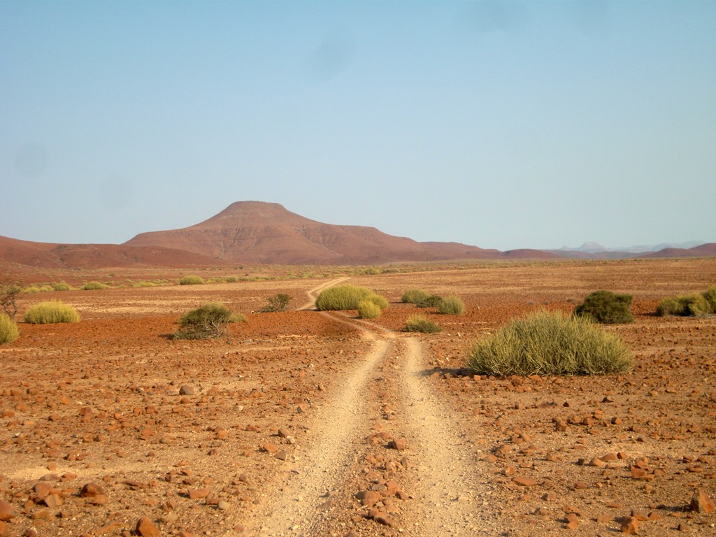 Die Strecke am nächsten Tag hatte dann völlig anderen Charakter. Über teils grottenschlechte Piste ging es wieder aus dem Tal heraus in ein wüstenhaftes Hochtal. Dort erwarteten uns grandiose Rückblicke zum Brandbergmassiv und eine endlos und lebensfeindlich erscheinender Steinwüste, umgeben von Bergen mit teils sehr kuriosen Formen. Die Landschaft erinnert an so manchen Westernfilm.