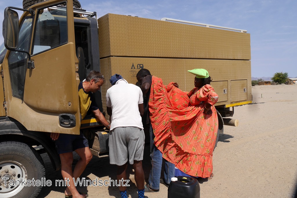 Von unserer langen Einkaufsliste hatte am Ende nur die Position “Saft” einen Haken. Was nun, da wo wir noch hinwollen gibt es mit Sicherheit gar nichts. Nach einer Inventur unser verbliebenen Vorräte und der Einschätzung der sich daraus mit etwas Erfindergeist ergebenden Möglichkeiten, stand schließlich fest, es muss gehen. Aber etwas Diesel sollte unbedingt noch in den Tank. Im Dorf hatten wir schon einige Hinweisschilder mit der Aufschrift ”Diesel,Petrol” gesichtet. Nach Anfrage beim Campingplatzbesitzer stellte sich heraus, dass er derjenige sei, welcher diesen “Service” anbietet. Also fuhren wir mit ihm zu seinem Haus. Dieses war, ortsüblich, etwa 3×5 m groß, einstöckig und war trotzdem noch in 2 Räume aufgeteilt. Hier lebt also der Campingplatzbesitzer mit seiner Familie. Nun waren wir froh, seine einfache Campsite angefahren zu haben. Und dass der Diesel hier naturgemäß das doppelte kostet (also dann etwa so viel wie in Deutschland), geht auch in Ordnung. Dieser muss schließlich erst von weit her herangekarrt werden und lagern muss er ihn ja auch noch in seinem kleinen “Haus”. Das Betanken war dann auch noch eine lustige Aktion, wie das Bild zeigt.