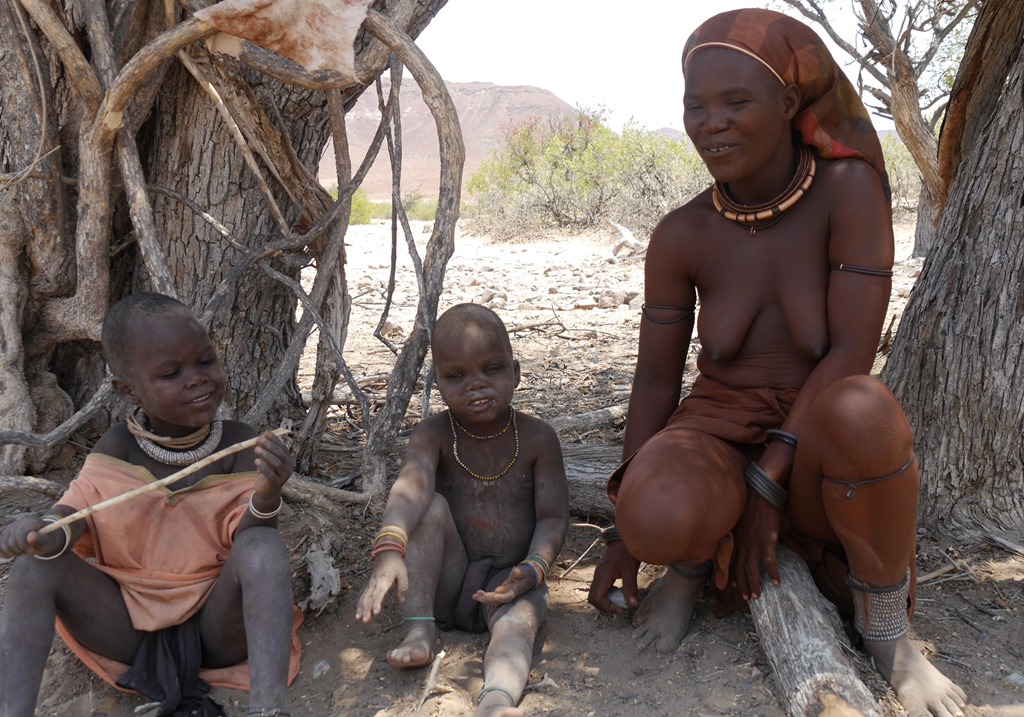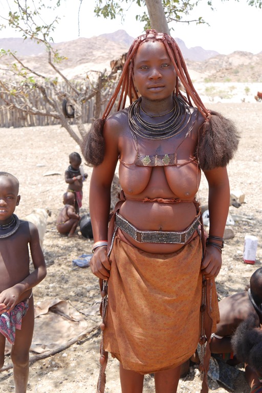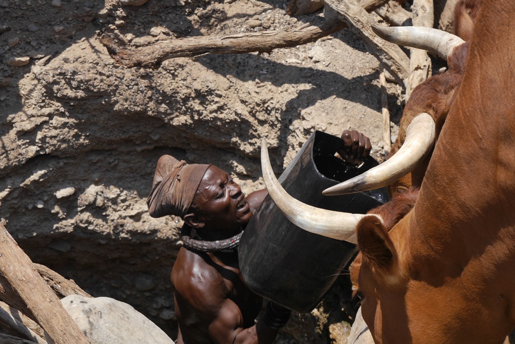 Da uns bisher hier in Namibia, nicht nur wegen der sehr dünnen Besiedlung, die menschlichen Begegnungen gefehlt haben, freuten wir uns sehr über zwei intensive Begegnungen mit den Himbas. Die Himbas sind ein nomadisches Hirtenvolk, welches man nur noch hier oben in dieser relativen Abgeschiedenheit in seiner ursprünglichen Lebensform erleben kann. Himbas hatten wir vorher schon einige gesehen. Die ersten in Swakopmund bettelnd oder sich aufdringlich für Fotos anbietend, gegen Geld natürlich. Auch gibt es Himba Museumsdörfer, wo ganze Busladungen ausgekippt werden. Das hatten wir uns erspart. Unsere erste Begegnung war vollkommen unerwartet. Wir trafen auf eine einzige Familie, normalerweise leben die Himbas in kleinen Dorfgemeinschaften. Aber diese Familie lebt allein, völlig abgeschieden. Der Vater schöpfte gerade, tief im Brunnen stehend, Wasser für seine Kühe nach oben.