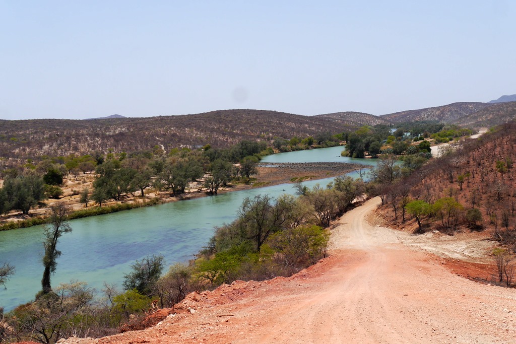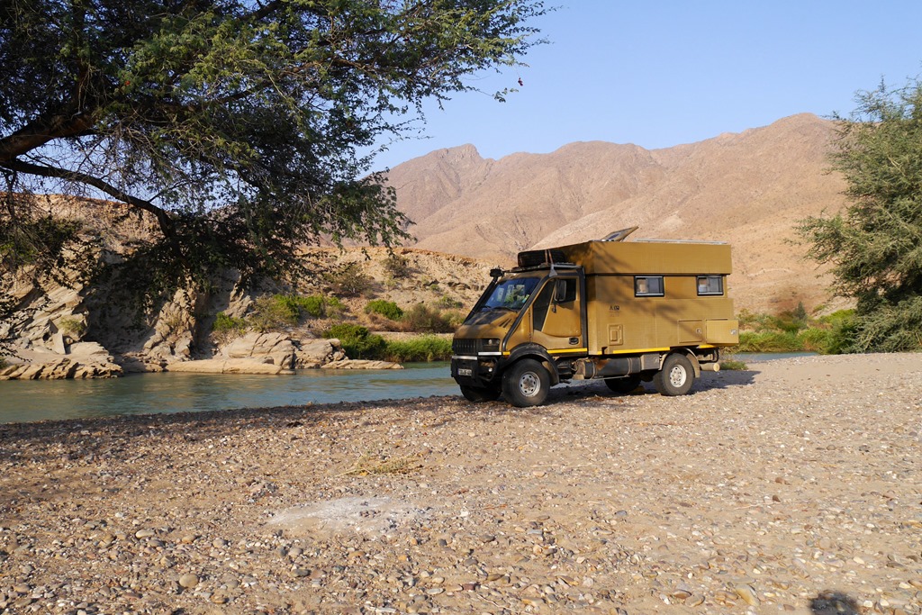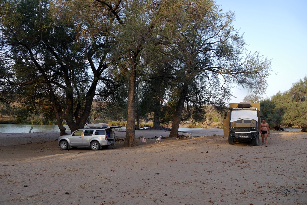 Dieses Erlebnis der besonderen Art lieferte uns noch den ganzen langen und warmen afrikanischen Abend Gesprächsstoff. Und eine Idee wurde “geboren”. Dazu aber später. Der letzte Abschnitt durch das Marien-Flusstal war dann fahrtechnisch richtig entspannend. Das riesige Tal ist fast so gerade wie ein Tisch und der Fahrer kann auf sandiger Piste nicht viel falsch machen und auch mal seinen Blick über die weite Gras- und Buschlandschaft schweifen lassen. Am späten Nachmittag erreichten wir dann ein winziges Dorf am Kunene River. Hier gibt es auch zwei Campsites, aber beide sagten uns nicht so recht zu. Wir hatten ja alles dabei und die Dinge, welche uns fehlten, konnten wir da auch nicht bekommen. Wir suchten uns also selbst einen wunderschönen Platz am Fluss, der war dann uns ganz allein.