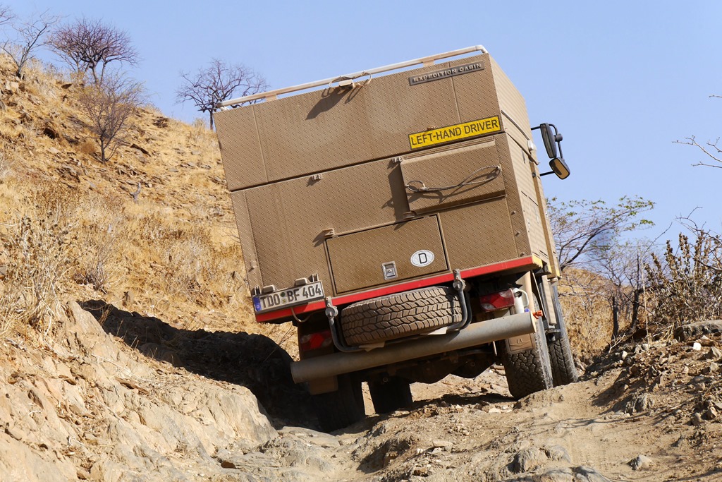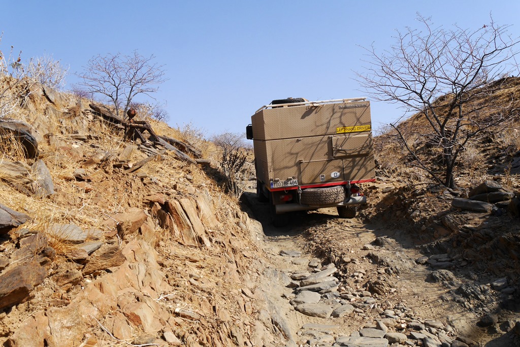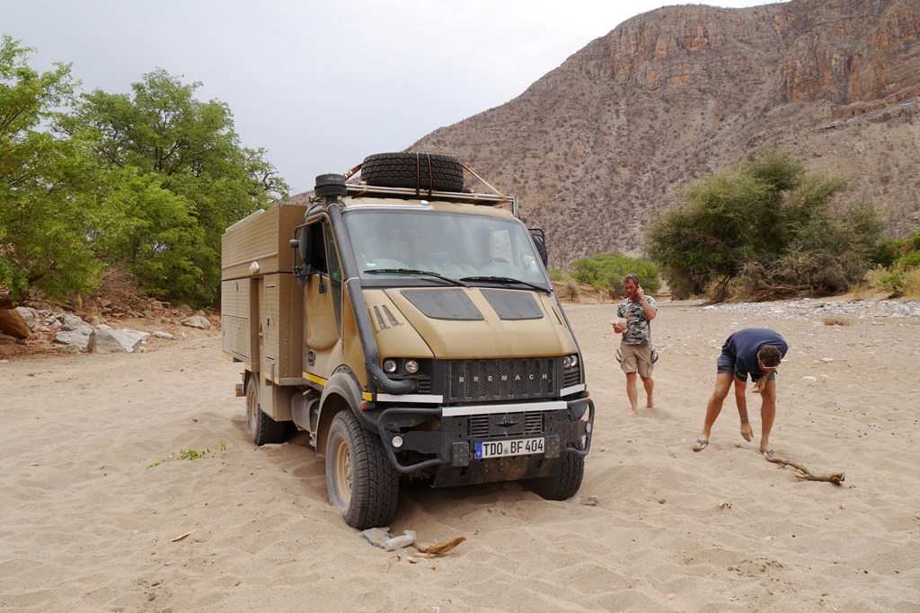 Gut erholt nehmen wir am nächsten Tag den nächsten „Leckerbissen“ die „Khowarib Schlucht“ unter die Räder. Gleich zu Anfang müssen wir einen steilen Felshang mit Steinen befahrbar machen und wir befürchten schon Schlimmeres. Zunächst aber können wir uns an einer wunderschön grünen Flusslandschaft, eingebettet in Felsen mit ständig wechselnden Farben und Formen, erfreuen. Der Fahrweg ist manchmal, besonders bei den häufigen Flussbettquerungen, nicht eindeutig zu erkennen, sodass wir oft erst den Ausgang zu Fuß suchen müssen, denn ein Halt im Sand kann arbeitsreiche Folgen haben, so wie uns einmal passiert. Was bedeutete Luftdruck reduzieren, schaufeln, Steine ranschleppen und unterbauen, anschließend natürlich wieder Luft aufpumpen, denn es geht ja da im ständigen Wechsel zwischen Sand und felsigem Untergrund.