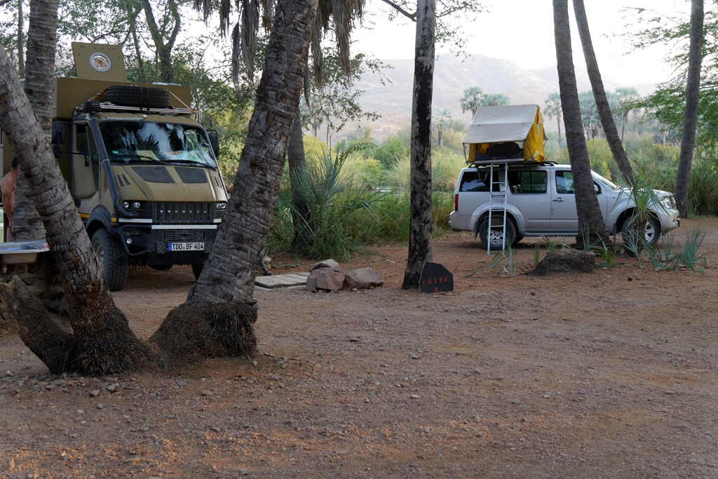 Den dritten Tag am Kunene verbrachten wir dann wildromantisch und frei auf der Strecke nach Ruacana. Dort standen wir direkt am Fluss und am Abend gab es selbst gefangenem(!)Fisch vom Lagerfeuer. Wir sind ab hier übrigens mit zwei Fahrzeugen unterwegs. Gabor, unser hilfsbereiter „Nachbar“ vom Campingplatz, ist mit Geländewagen und Dachzelt nicht zum ersten Mal in Namibia unterwegs, die „Chemie“ stimmt sofort und wir beschließen einige Tage gemeinsam zu reisen.