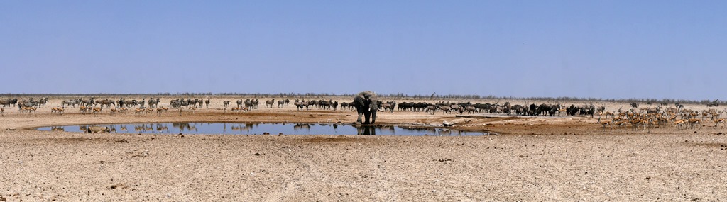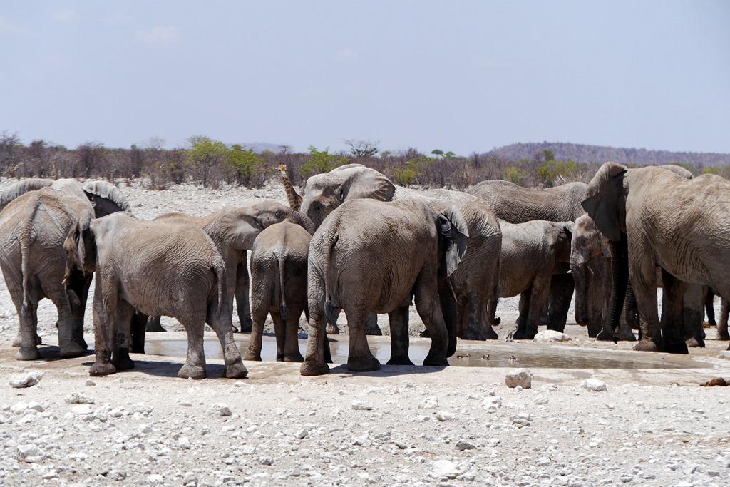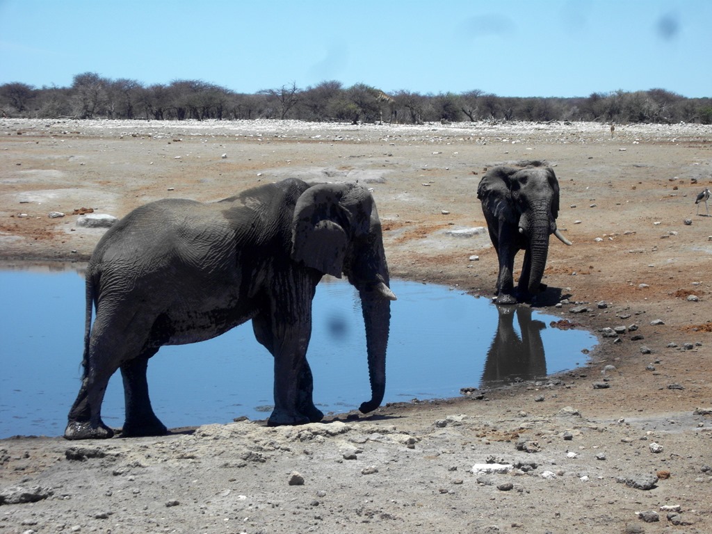 Nachdem wir doch noch einen zweiten Tag Erholung im Oppi Koppi Camp angehängt hatten, standen wir bereits gegen 9.00 Uhr des nächsten Tages am Galtongate des Etosha Nationalpark. Dieses Tor und der Westteil des Nationalparks sind erst seit 2014 für die Öffentlichkeit zugänglich und sicher aus diesem Grund, wie wir feststellen konnten, auch noch weniger frequentiert als der Ostteil des Park`s. Im ebenfalls erst neu gebauten “Olifants Camp” bekamen wir, auch ohne Reservierung, einen Stellplatz. Das Camp besitzt ein superschön angelegtes Wasserloch zur Tierbeobachtung. Der großzügig angelegte Aussichtsturm hat zwei Stockwerke, liegt direkt am und über dem Wasser und man kann die Tiere wirklich aus nächster Nähe bestaunen. Einziger Nachteil ist das Rotlicht, mit dem die Umgebung nachts dezent angestrahlt wird, eignet sich absolut nicht für schöne Fotos. Das hat aber wieder den Vorteil, dass sich das Gewusel und die Klickgeräusche der Kameras in Grenzen halten und man so auch mehr Muse hat, sich der eigentlichen Tierbeobachtung zu widmen. So haben wir aber leider auch keine Fotos von den nachtaktiven Tieren, wie den Nashörnern. Macht aber überhaupt nichts, denn was uns an den folgenden Tagen an überwältigenden Tierbegegnungen noch erwarten sollte, übertraf unsere Erwartungen. Wir hoffen die Fotos bringen wenigstens etwas von dem rüber, was man so fühlt, wenn unmittelbar neben dem eigenen Auto Löwen verschlafen in die Kamera blinzeln, oder sich am Wasserloch Hunderte Tiere anstellen und darauf warten, nach Hierarchie der Tiergesetze, an der Reihe zu sein. Oder, wenn zwei riesige Elefantenbullen am Wasserloch um die Vorherschafft rangeln und man nicht weiß, ob der Verlierer nicht vielleicht seinen Frust an Deinem etwa 15 Meter entfernt stehenden Auto auslässt. Er stand da so über mehrere Minuten ohrenwedelnd und “Blickkontakt” mit unserem Bremach haltend. Seine Nerven waren übrigens stärker als unsere, sicherheitshalber räumten wir das Feld im Rückwärtsgang.