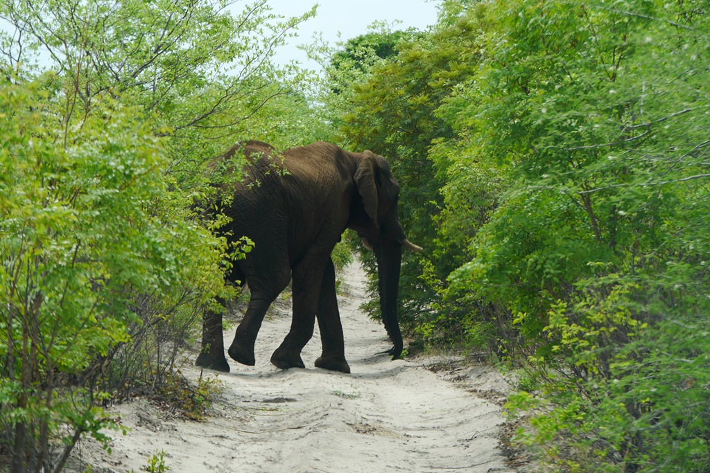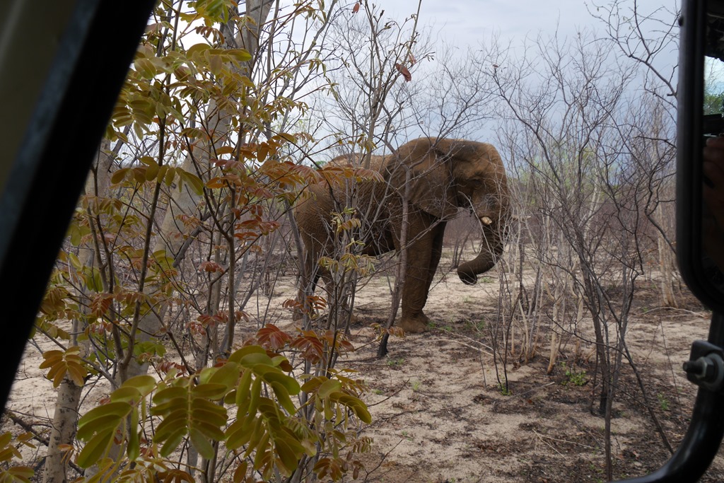 Am nächsten Tag erleben wir bei einer Fahrt durch den Mahango Nationalpark unsere bisher aufregendste Begegnung mit Elefanten. Auf einem engen, sandigen und seitlich ziemlich dicht bewachsenem Fahrweg entdecken wir einen Elefantenbullen erst spät. Dieser gibt uns zugleich deutlich zu verstehen, bis hierher und nicht weiter. Also machen wir das. Motor aus und abwarten was passiert. Damit gibt er sich zufrieden und frisst weiter aber nicht ohne dabei langsam auf uns zuzukommen. Er bleibt schließlich neben dem offenen Beifahrerfenster stehen und „berüsselt“ unser Auto ausgiebig, zum Glück aber nicht meine zur Salzsäule erstarrte Frau. Um seine Augen neben dem Beifahrerfenster sehen zu können, musste ich mich nach unten beugen. Unsere Fenster enden etwa bei 2,50m und bei den Augen ist der ja noch nicht zu Ende!